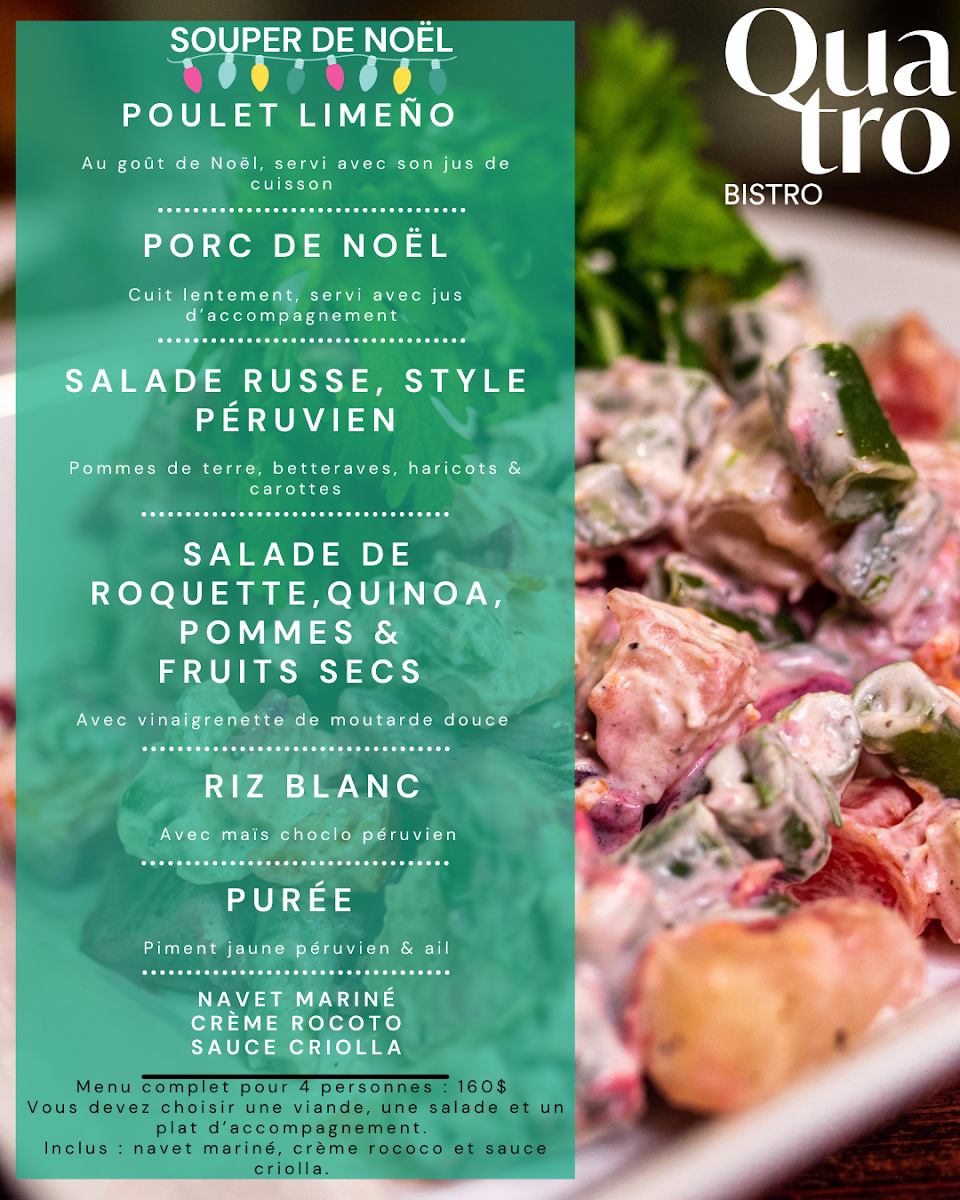 Rotisserie lovers won’t want to miss Quatro's standout offerings. Their whole Poulet style péruvien à la braise is a family favorite, succulent and infused with mouthwatering spices, served alongside perfectly crispy fries or fluffy rice, and a fresh house salad. If you’re dining solo or in a smaller group, you can opt for the Demi poulet, still loaded with the same robust flavors but designed for lighter appetites.