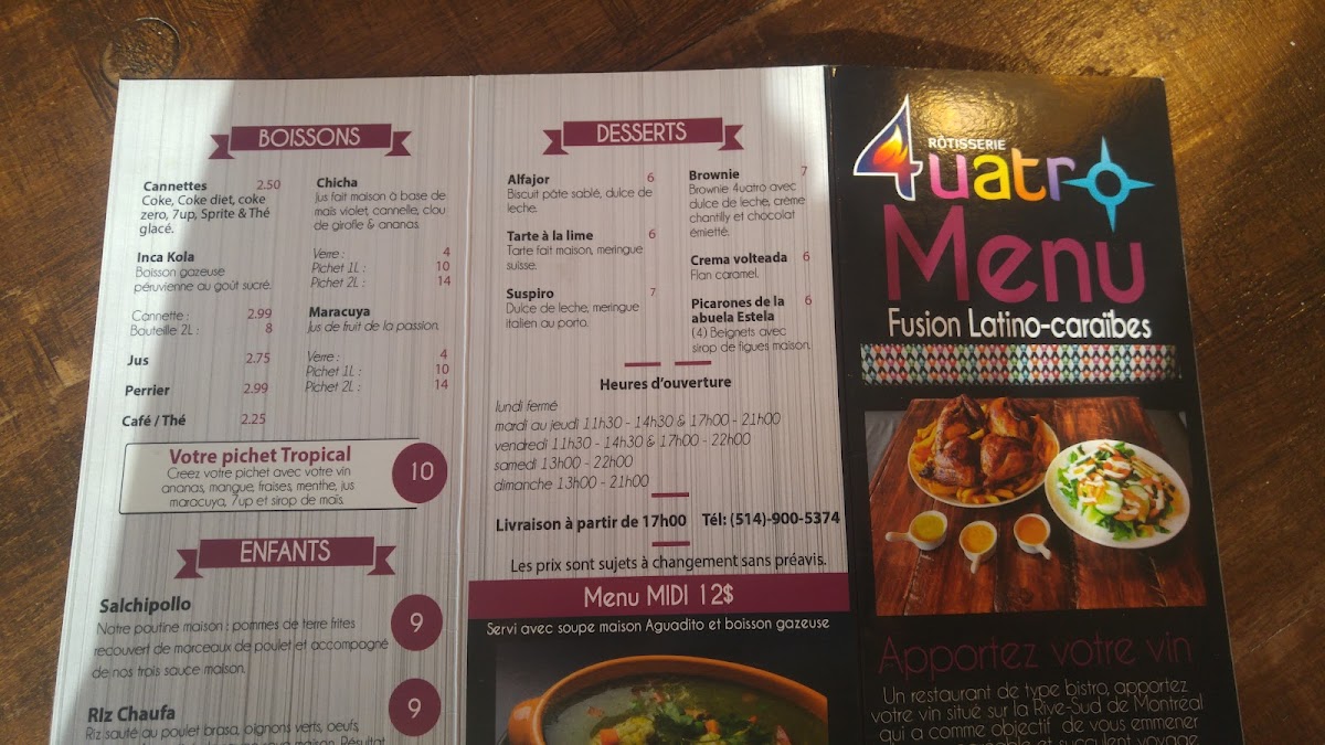 Welcome to Quatro Bistro, a hidden gem in La Prairie, QC, that invites you to embark on a culinary journey through the vibrant flavors of Peru and Haiti. Nestled at 825 Chem. de Saint-Jean, this restaurant offers an enticing selection of dishes that weave together rich cultural heritages, creating a unique dining experience that is both comforting and exciting.