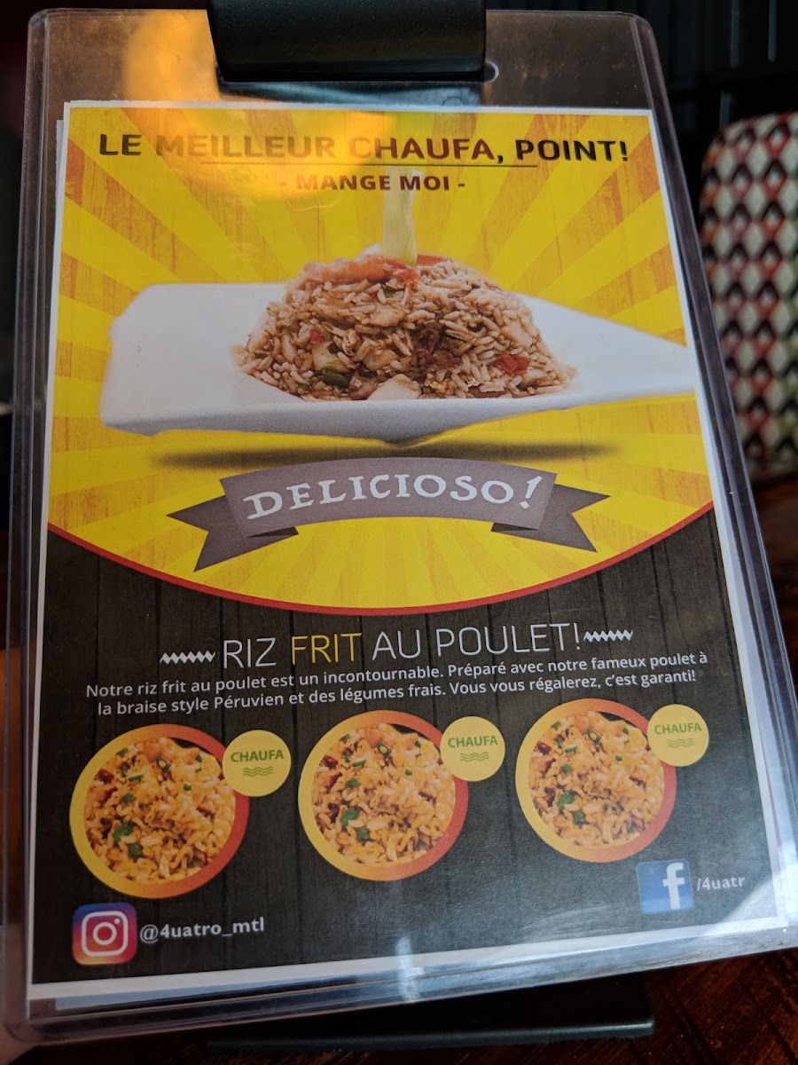 Side dishes like the Riz Chaufa, a delightful stir-fried rice with chicken, green onions, and vibrant bell peppers, showcase a beautiful blend of Asian and Peruvian flavors—a testament to Quatro Bistro’s dedication to culinary fusion. The unique incorporation of flavors leads to taste sensations that you won't forget!